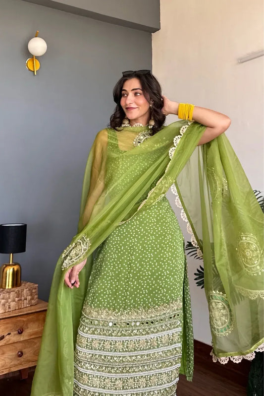 Wedding & Party Wear Mint Mehendi Green Anarkali With Sharara Set For Women