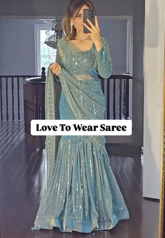 Party Wear Ready To Wear Soft Green & Silver Fish Cut Lehenga Saree