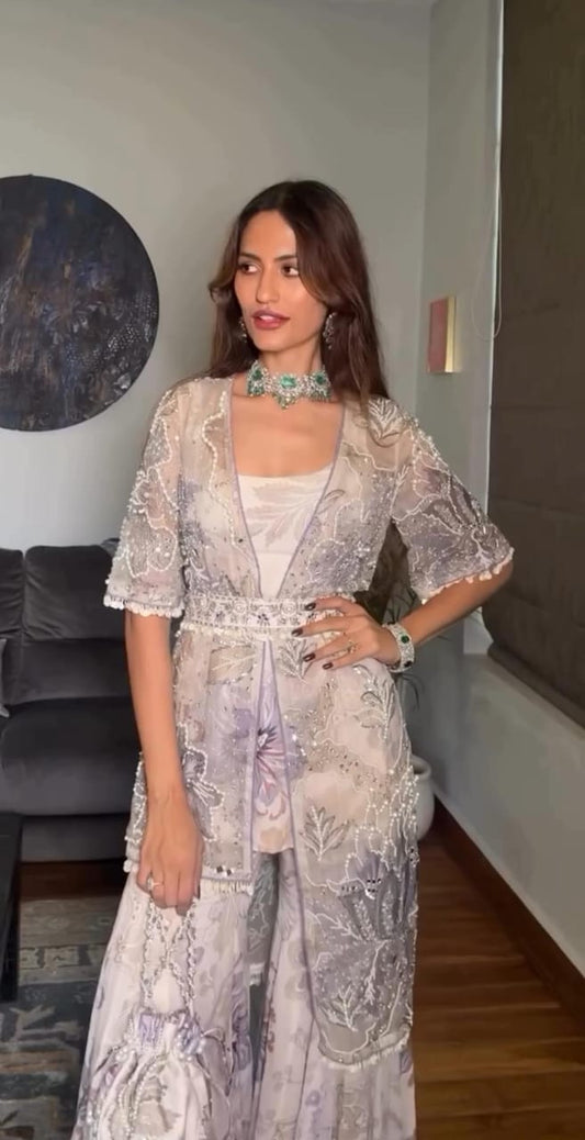 Floral Georgette Jacket Style Sharara Set with Pearl Work – Elegant Festive & Wedding Wear
