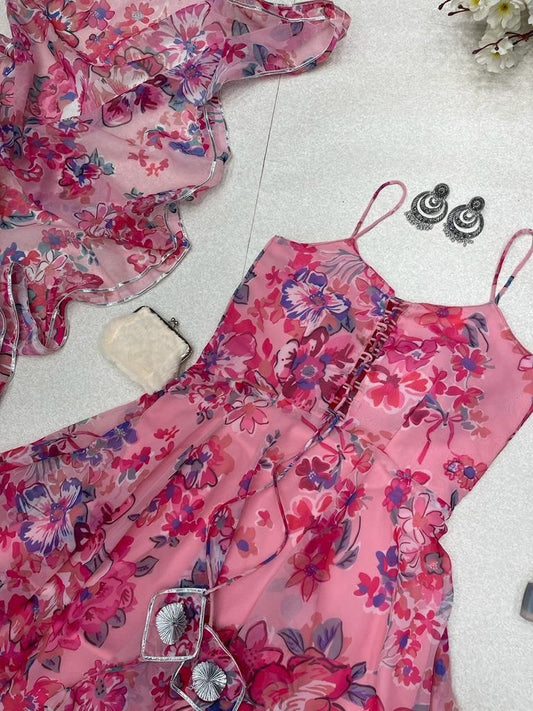 Luminous Pink Organza Silk Floral Digital Printed Anarkali Pant Suit