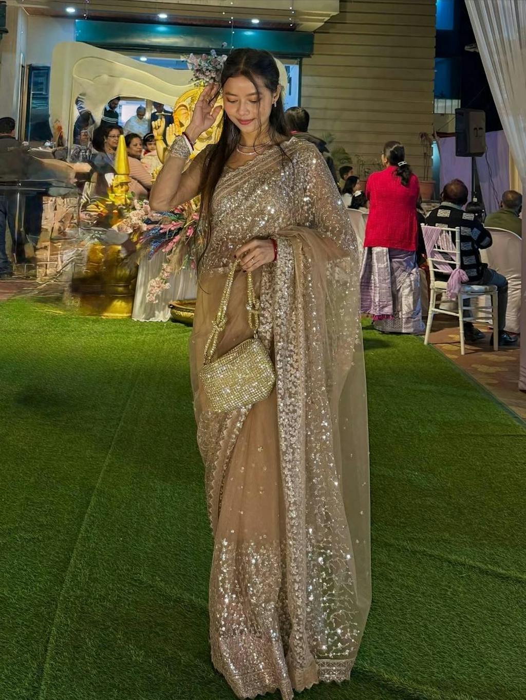 Golden Net Saree with Sequins & Dori Work – Party Wear Designer Saree with Unstitched Blouse
