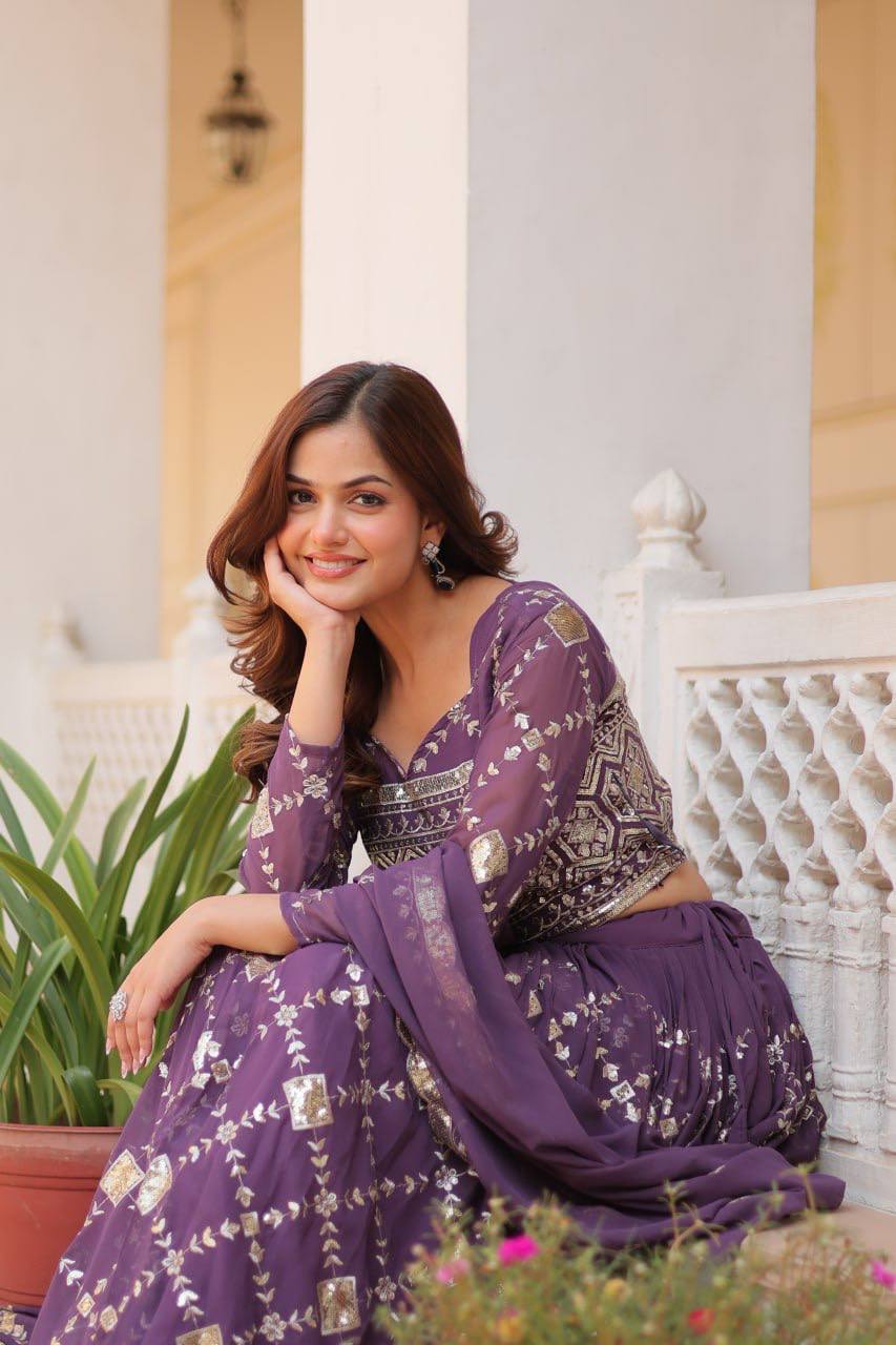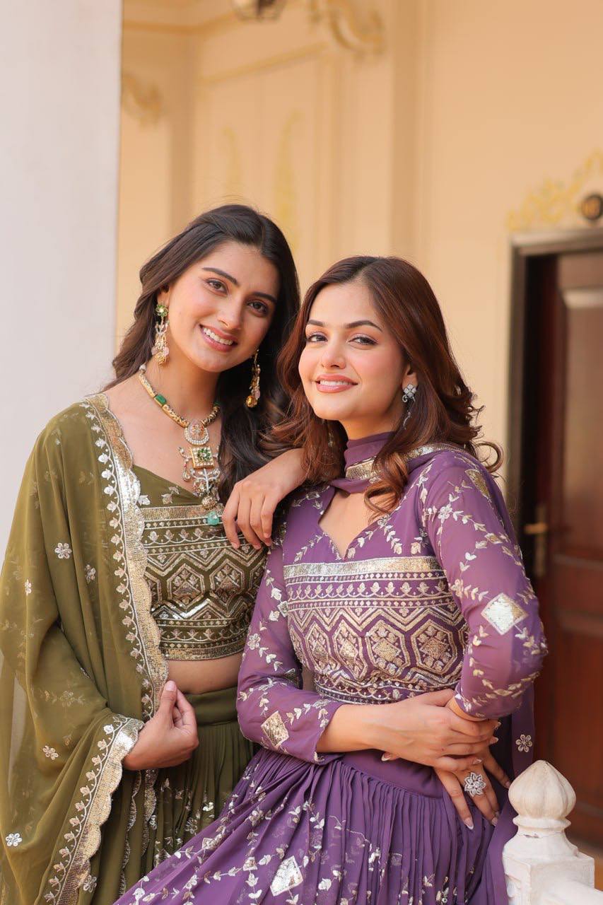 Make a statement with this luxurious Heavy Faux Georgette Lehenga Choli Set, designed with intricate embroidery sequence work for a rich and glamorous look. The elegant 3.5-meter flair of the lehenga creates a stunning flow, while the dori latkan closure adds a traditional touch. The choli is unstitched, allowing for a customizable fit, and the set is completed with a beautifully embroidered matching dupatta — making it a perfect choice for weddings, receptions, and festive occasions.
