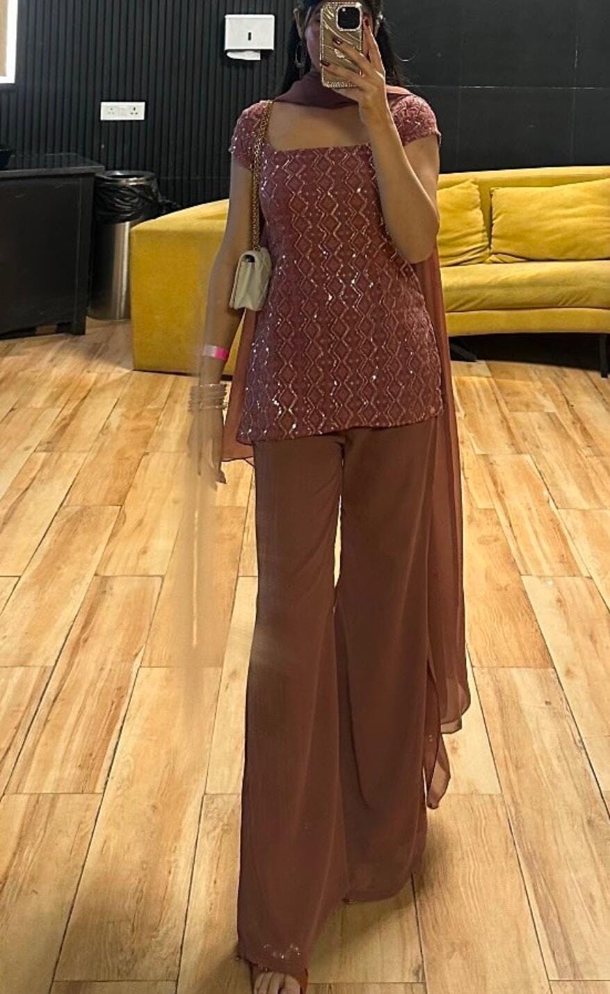 - Flowy Bell-Bottom Pants: A signature of the 90s, these pants are crafted from luxurious georgette, giving them that perfect, fluid drape. They hug your body for a modern “snatched” fit and flare out at the bottom, creating a dramatic silhouette reminiscent of classic Bollywood dance sequences.